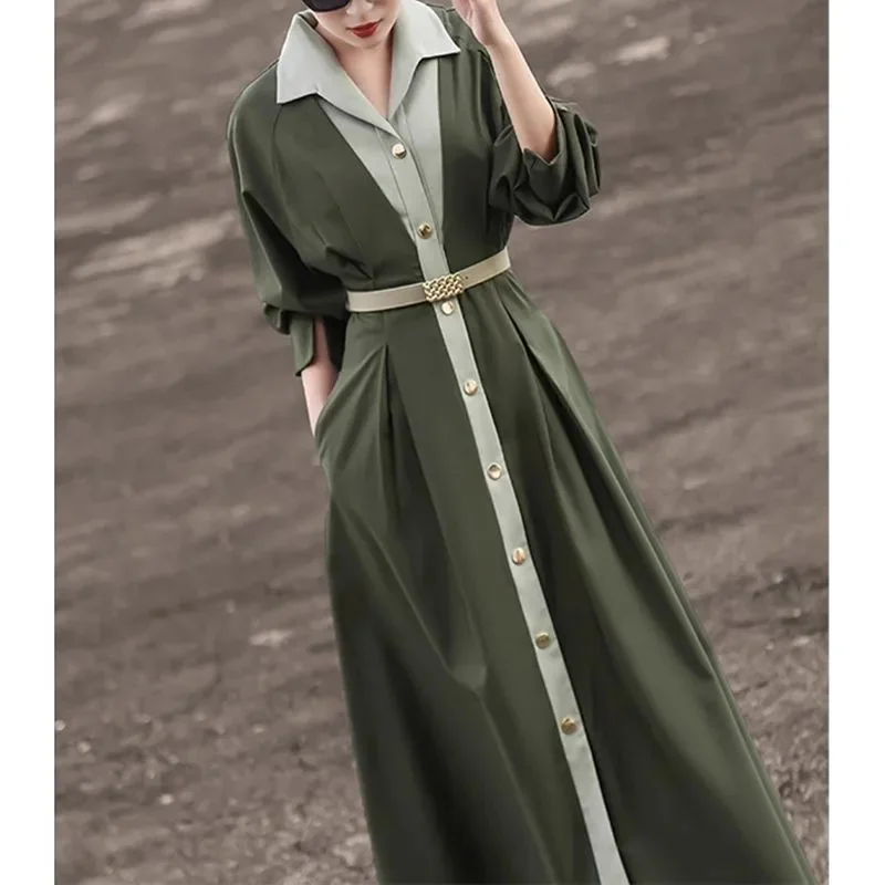 Robe Chemise Rétro Contrastée à Taille Ceinturée