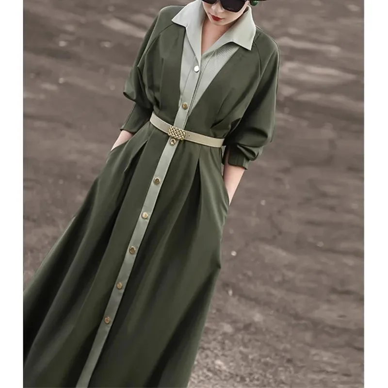 Conçue avec un col polo classique, des manches longues et une fermeture boutonnée sur toute la longueur, cette pièce se distingue par sa ceinture intégrée qui marque délicatement la taille. Sa longueur mi-mollet apporte équilibre et élégance à chaque mouvement.