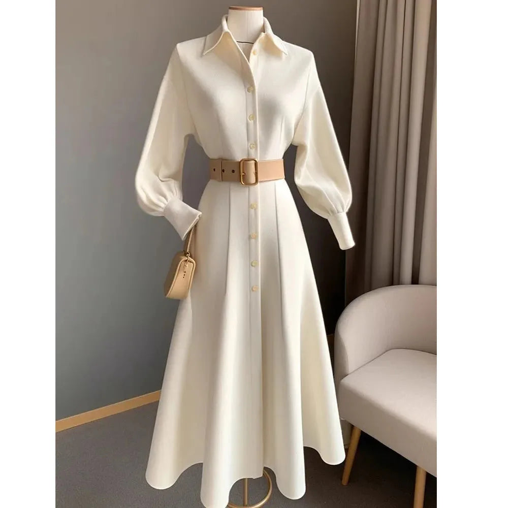 Dotée d’un col arrondi discret, de manches longues légèrement bouffantes et d’une taille naturellement marquée par une ceinture, cette pièce offre un équilibre parfait entre confort et maintien. Le tissu présente une légère élasticité pour un porter agréable tout au long de la journée.